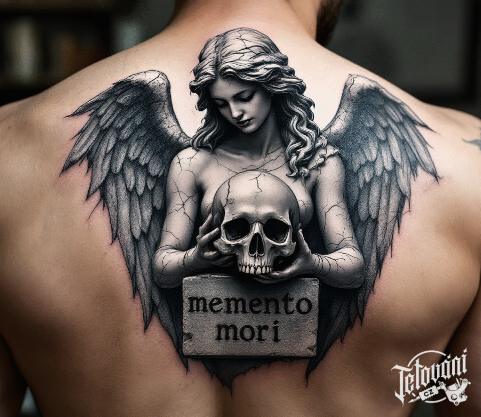 Tetování lebka, nápis, memento mori na záda