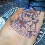 Tetování lebka, nápis na předloktí