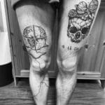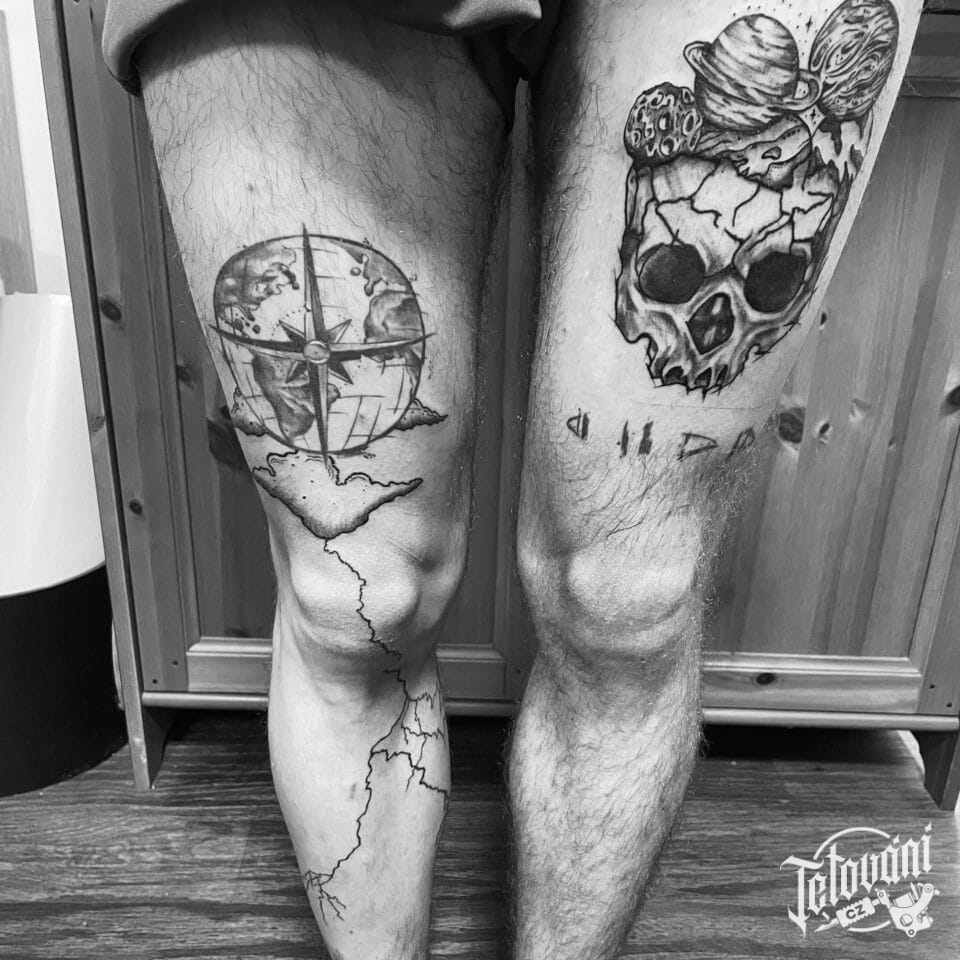 Tetování lebka, planeta země a znaky a symboly na stehna