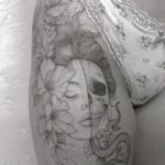 Tetování lebka, portrét ženy s květinami a hadem na boku