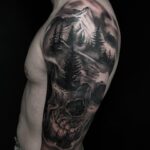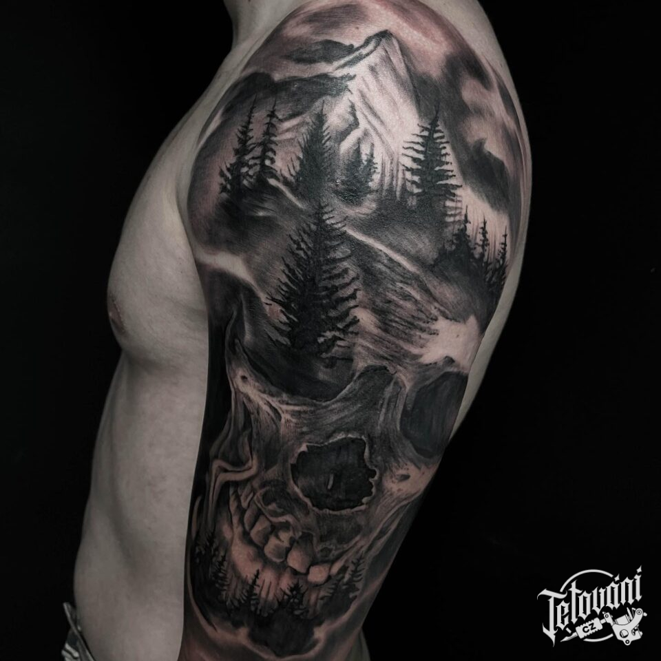 Tetování lebka, příroda, hory´, les na rameno
