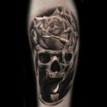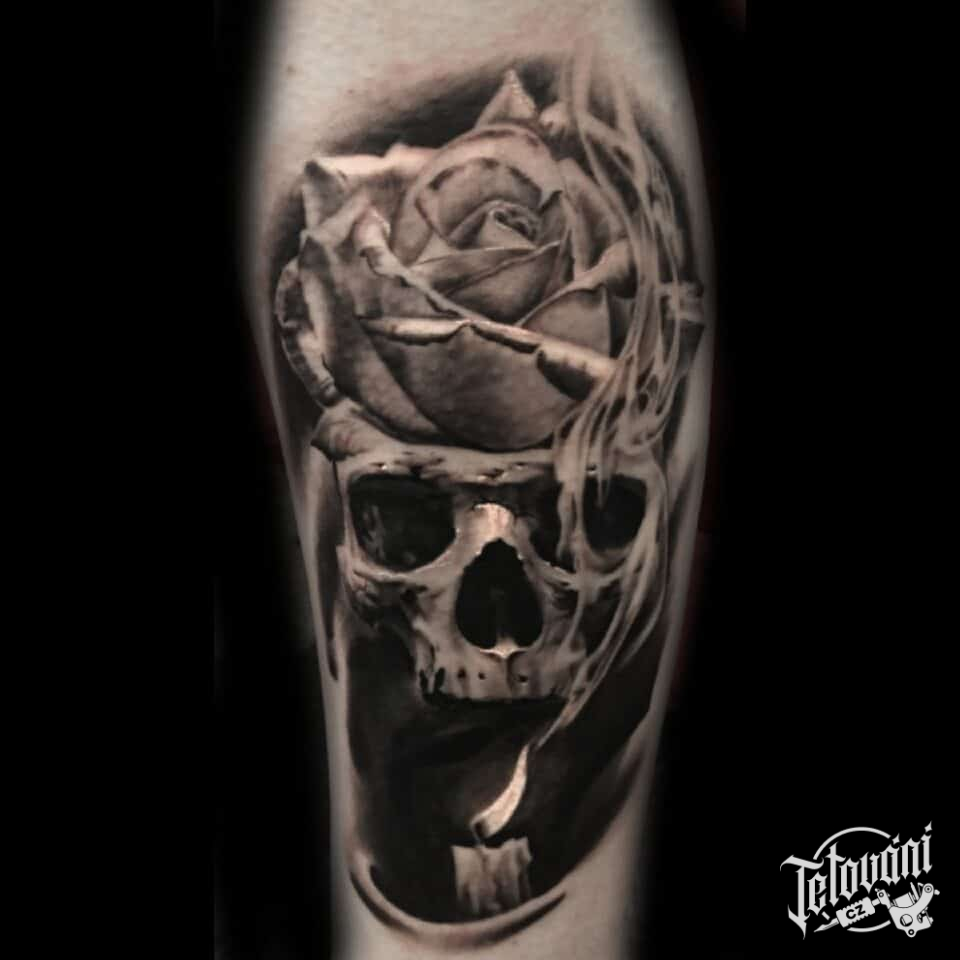 Tetování lebka, růže na lýtku