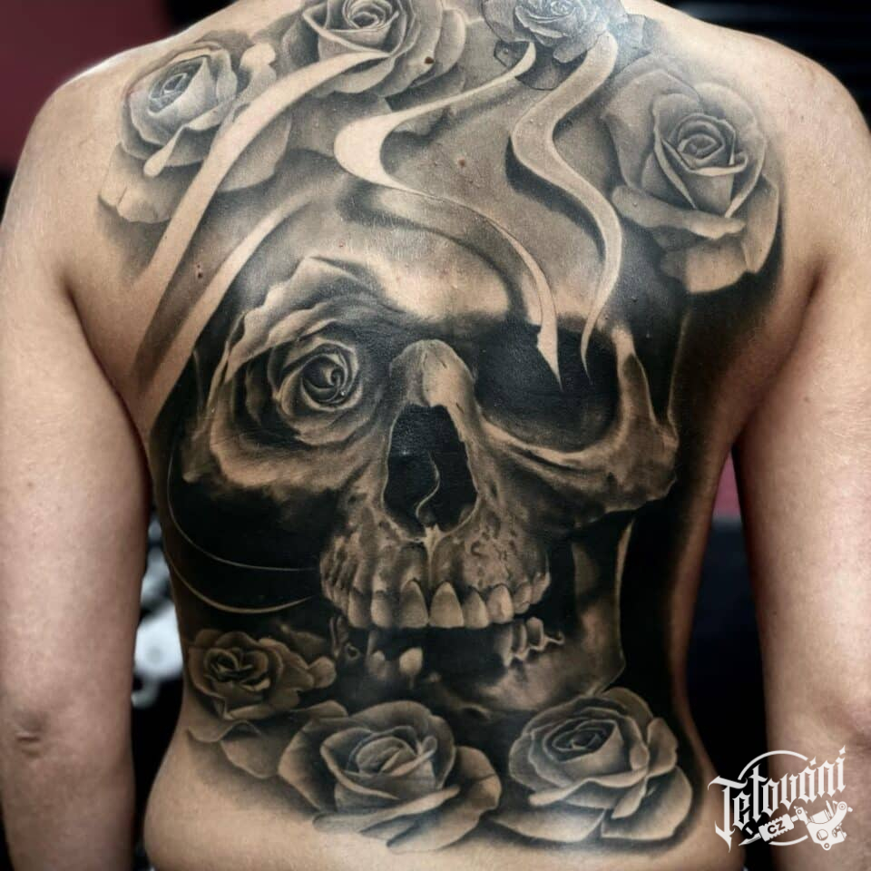 Tetování lebka, růže na zádech