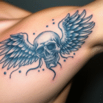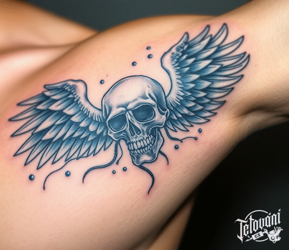 Tetování lebka s andělskými křídly, anděl smrti na rameni
