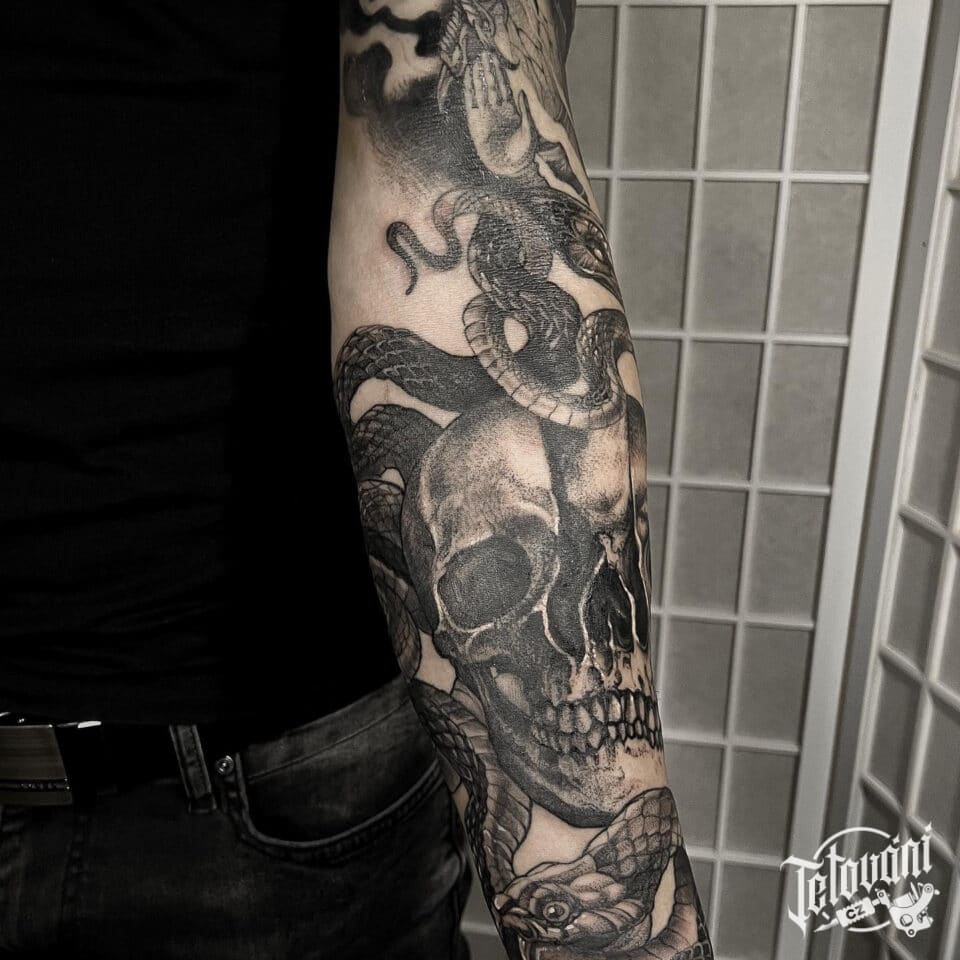 Tetování lebka s hadem na předloktí