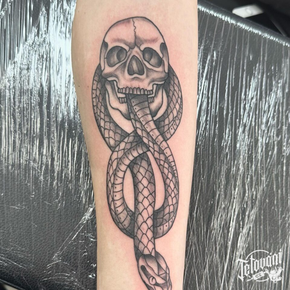 Tetování lebka s hadem na předloktí