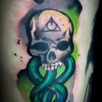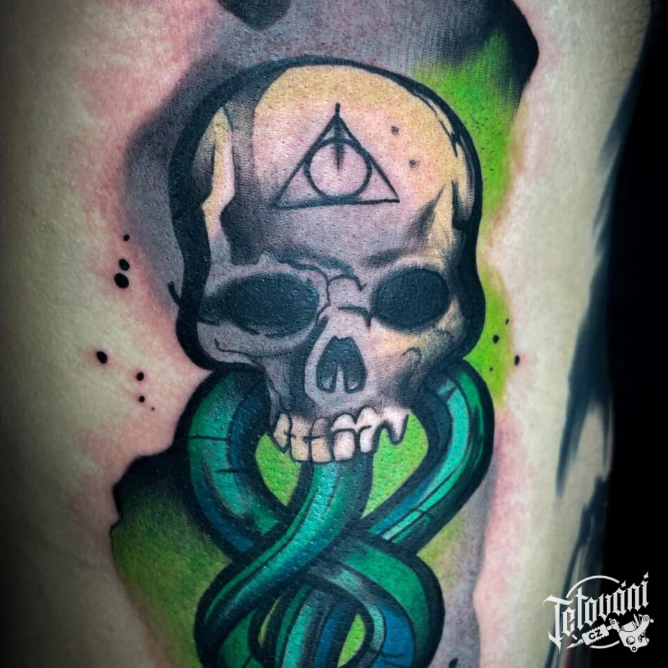 Tetování lebka s hadem, relikvie smrti z filmů a pohádek, symbol na bok