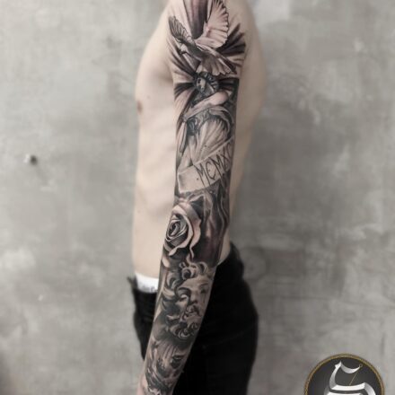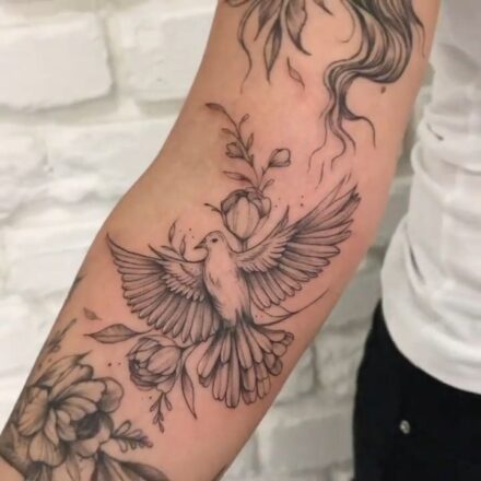 Tetování lebka s holubicí a nápisy na předloktí