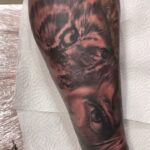 Tetování lebka s korunou a karty esa, nápisy, oči, kytarista, osobnost, portrét na předloktí