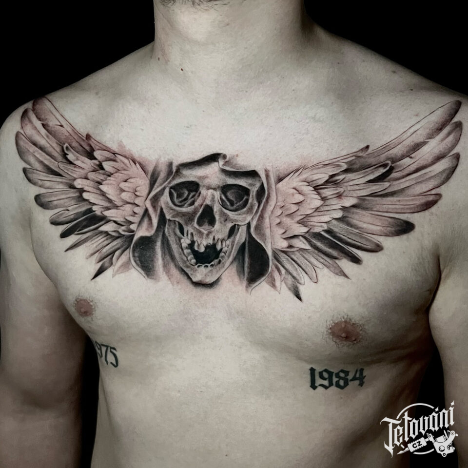 Tetování lebka s křídly na hrudník