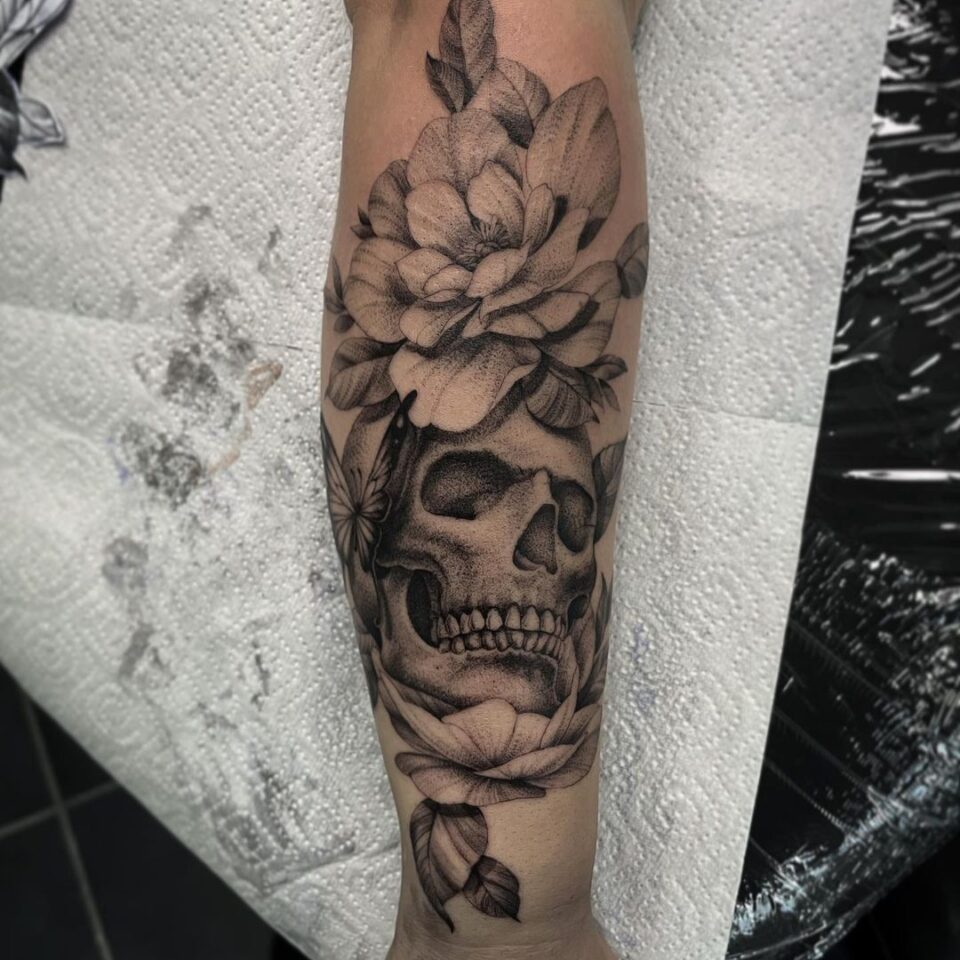 Tetování lebka s květinami a motýlem na předloktí