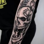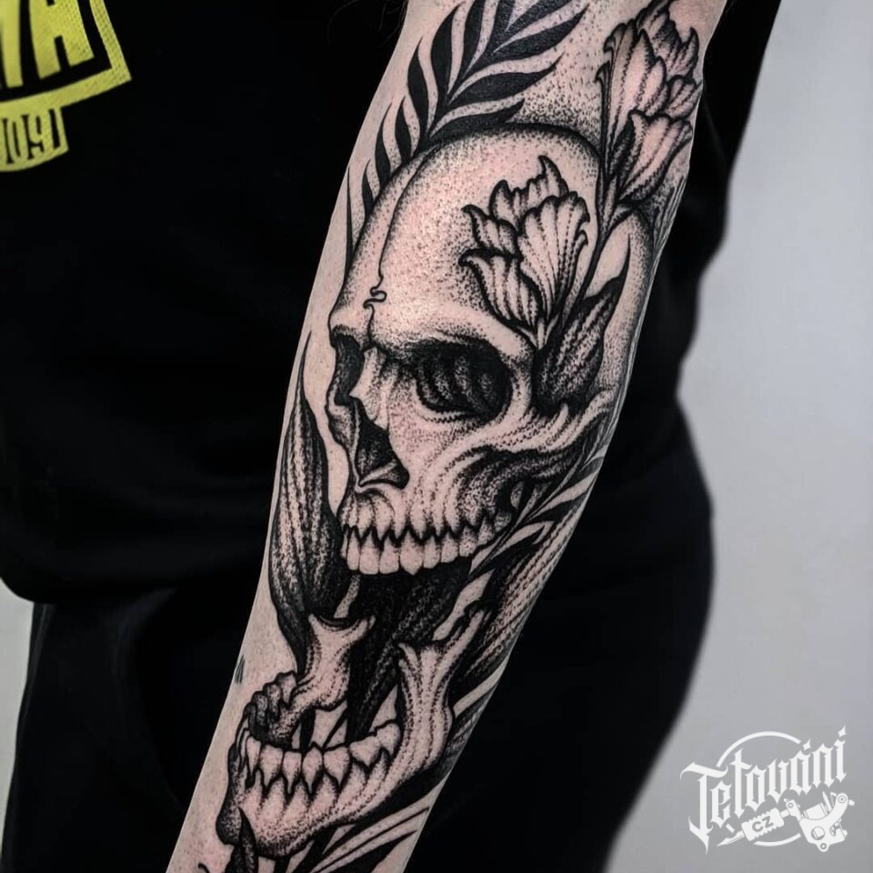 Tetování lebka s květinami na předloktí