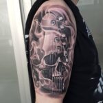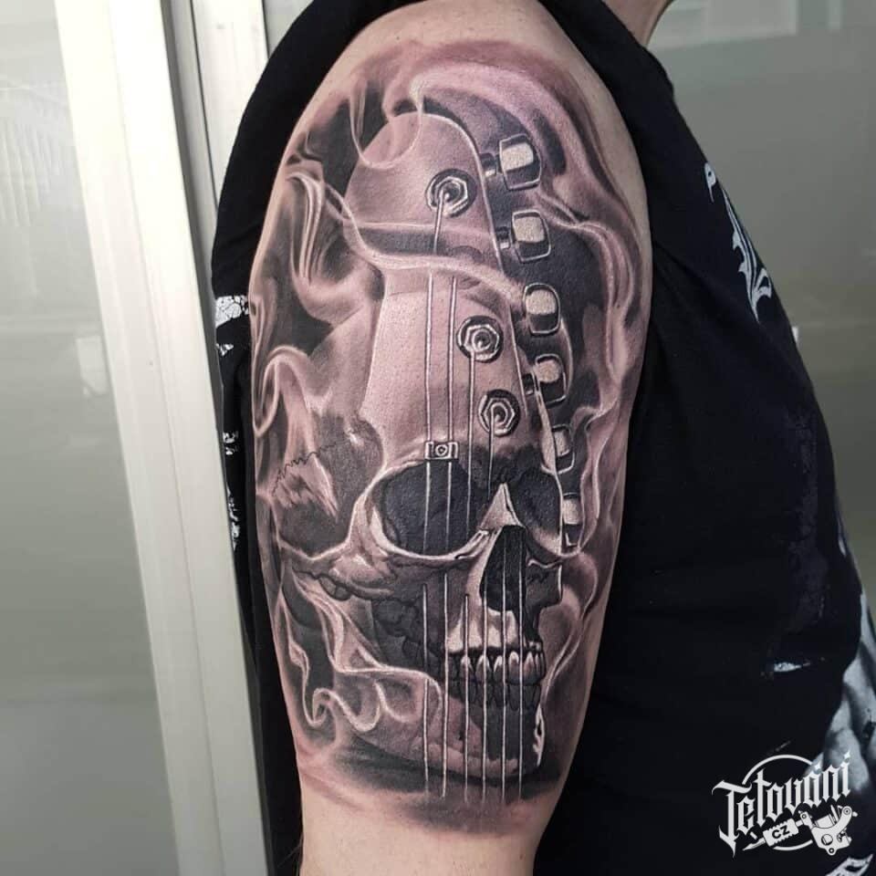 Tetování lebka s kytarou na rameni