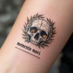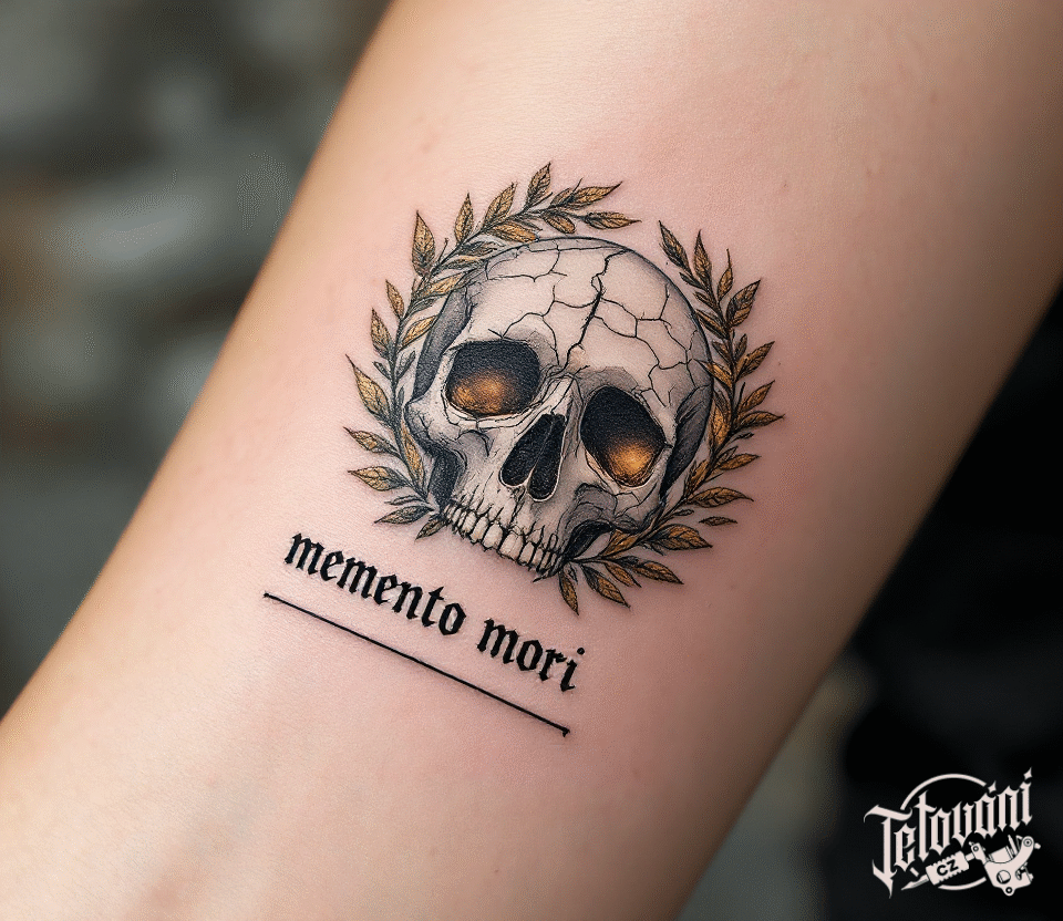 Tetování lebka s nápisem memento mori na předloktí