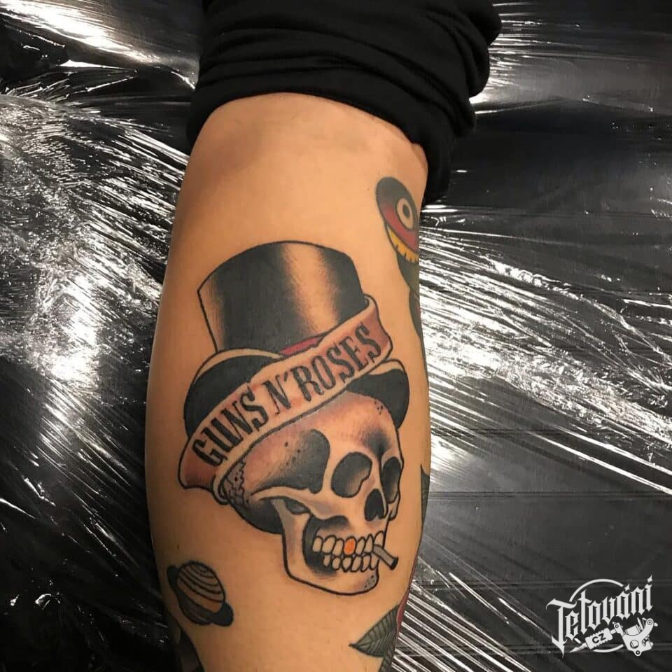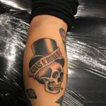 Tetování lebka s nápisem na lýtku