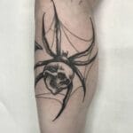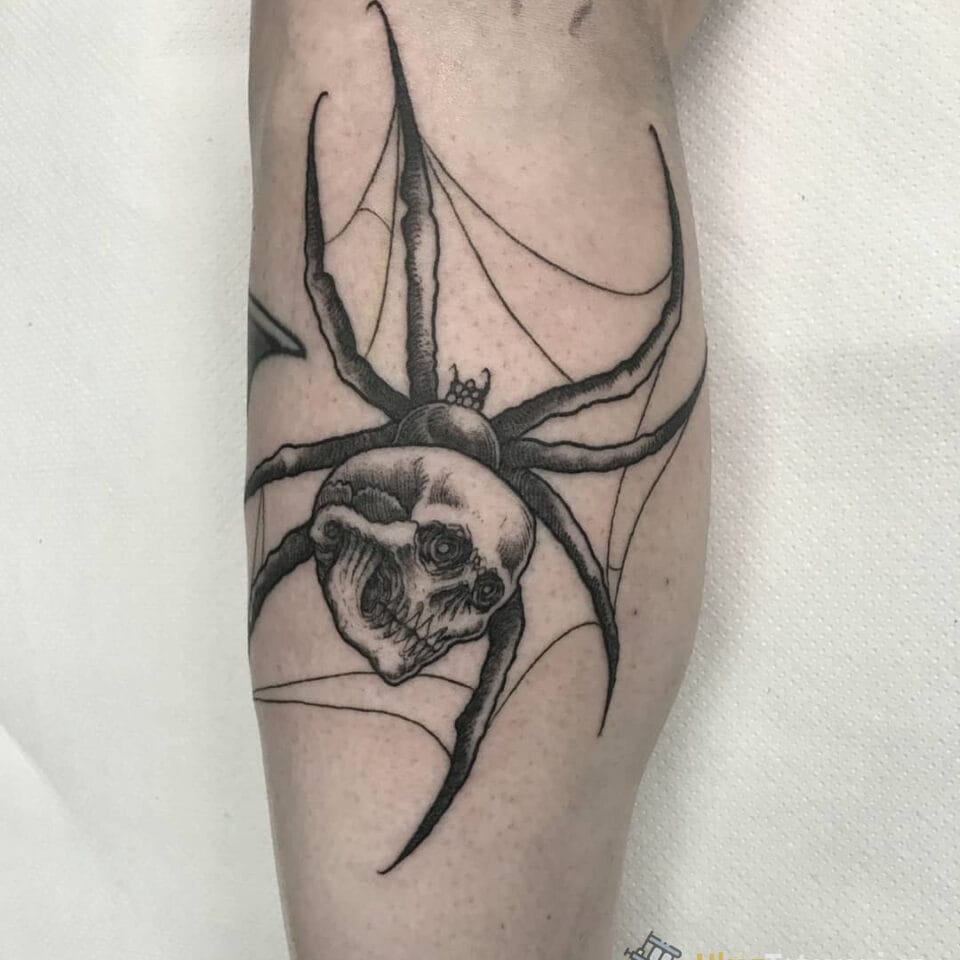 Tetování lebka s pavoukem na lýtko