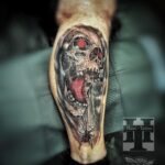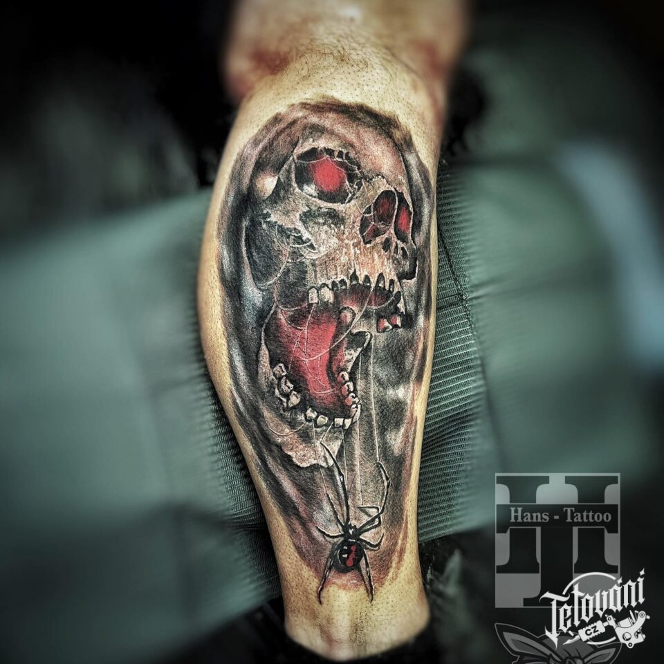 Tetování lebka s pavoukem na lýtku