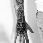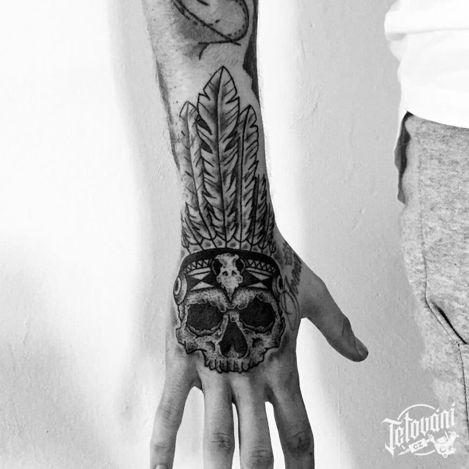 Tetování lebka s pírky na hřbet ruky