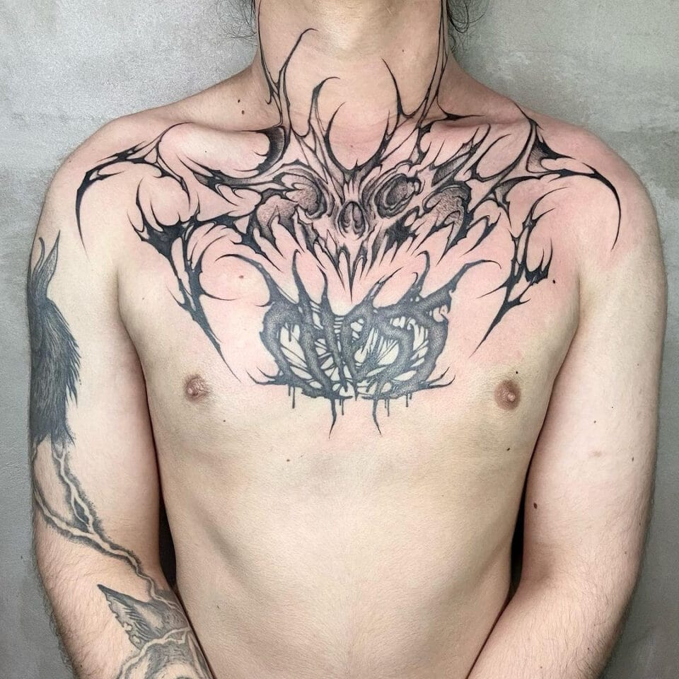 Tetování lebka s písmeny na hrudník