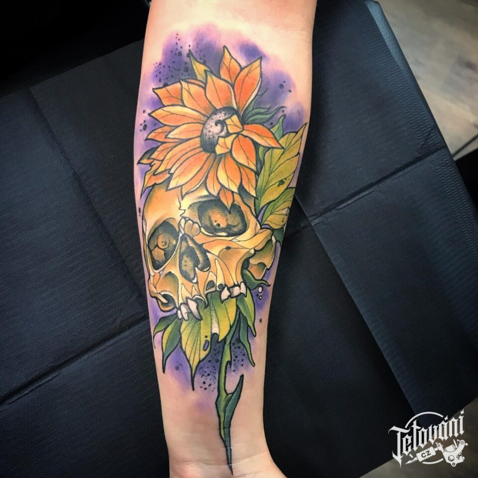 Tetování lebka se slunečnicí na předloktí