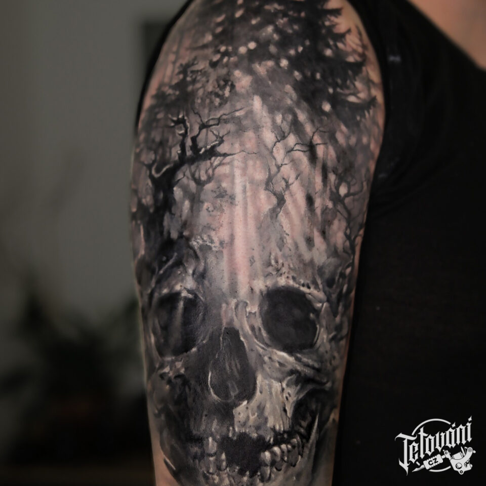 Tetování lebka, strom na rameni