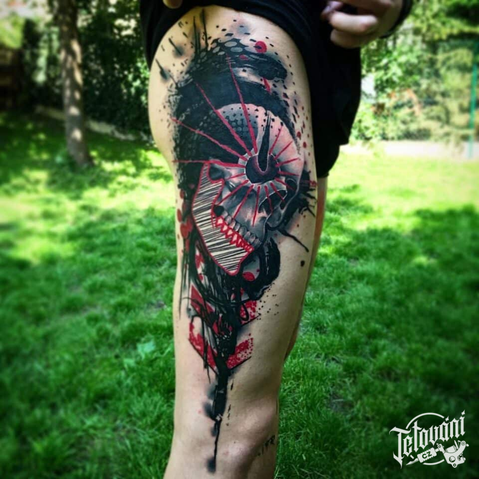 Tetování lebka, tvary na bok stehna