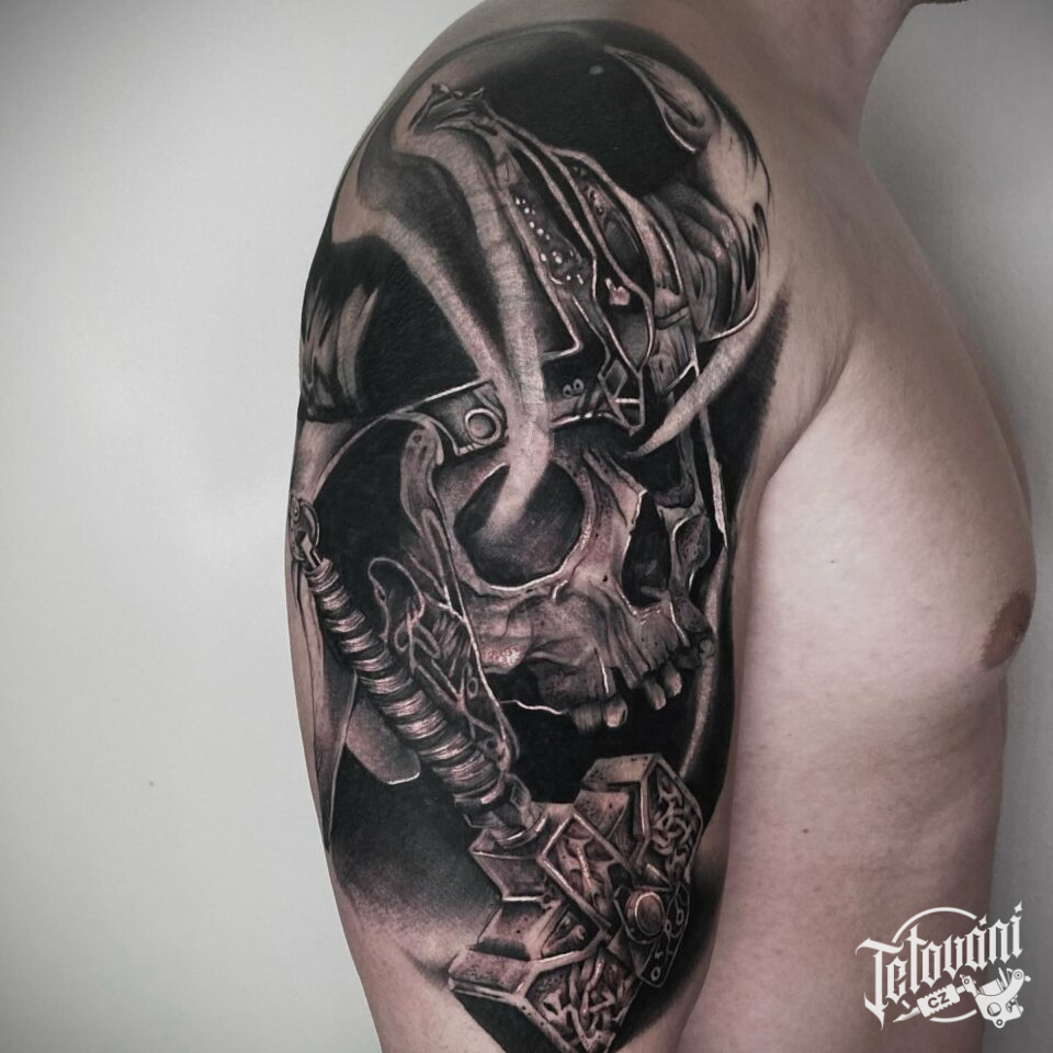 Tetování lebka vikinga na rameni