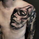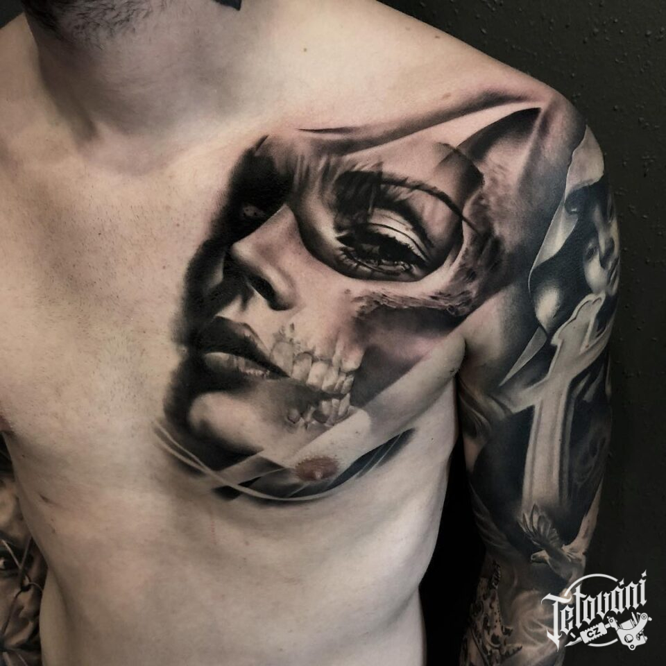 Tetování lebka, žena, portréty na prso