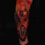 Tetování lebka, živel oheň, portrét na lýtko