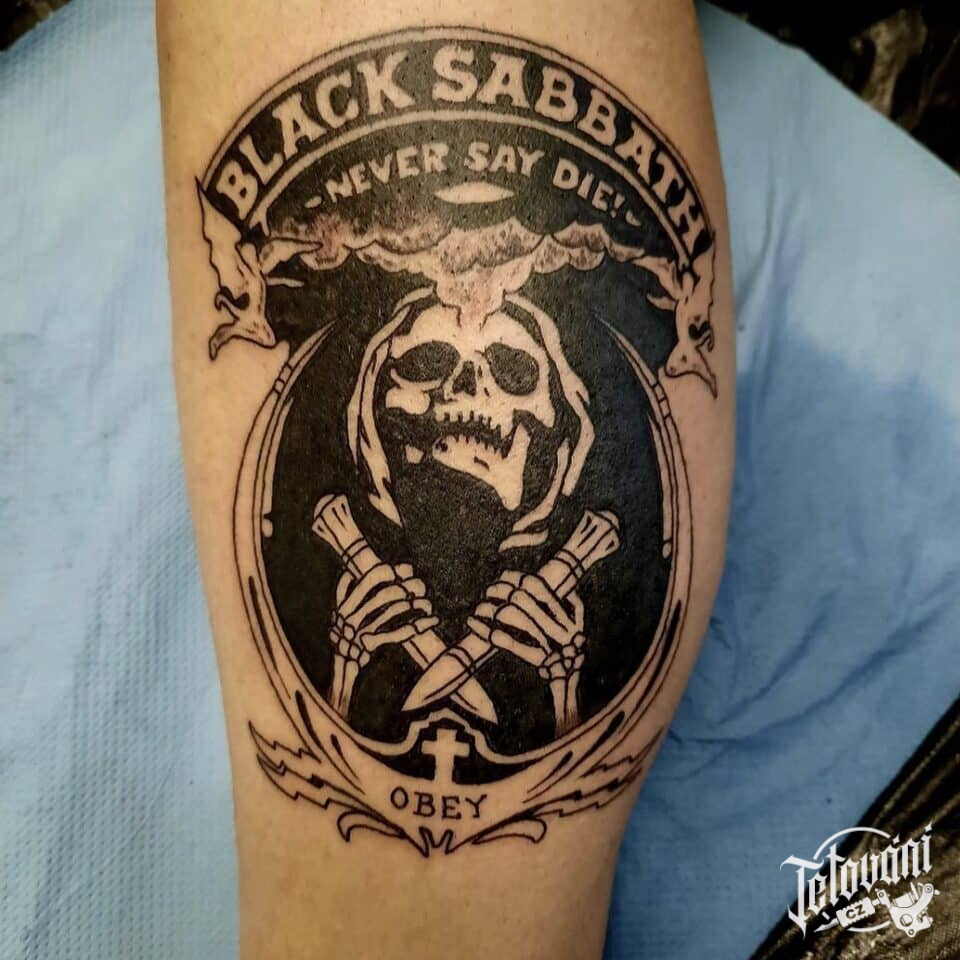 Tetování lebka, znaky a symboly, symbol hudby, metalu, nápisy, jméno skupiny na lýtko