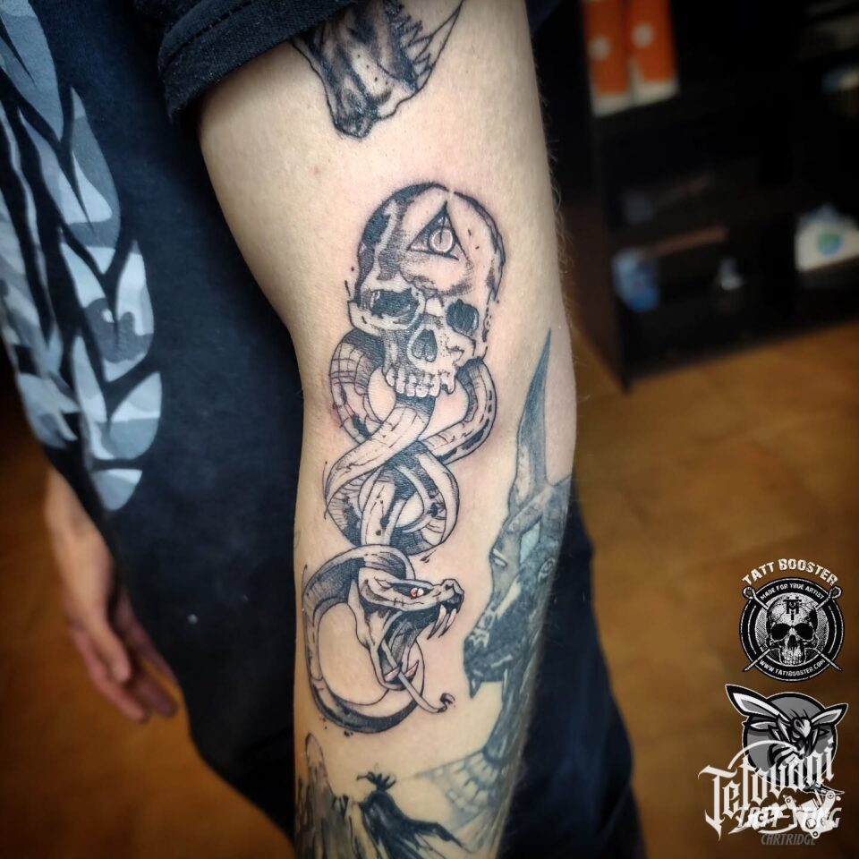 Tetování lebka, znaky a symboly z filmů a pohádek Harry Potter na rukáv
