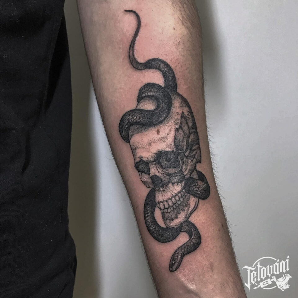 Tetování lebka s hadem na předloktí
