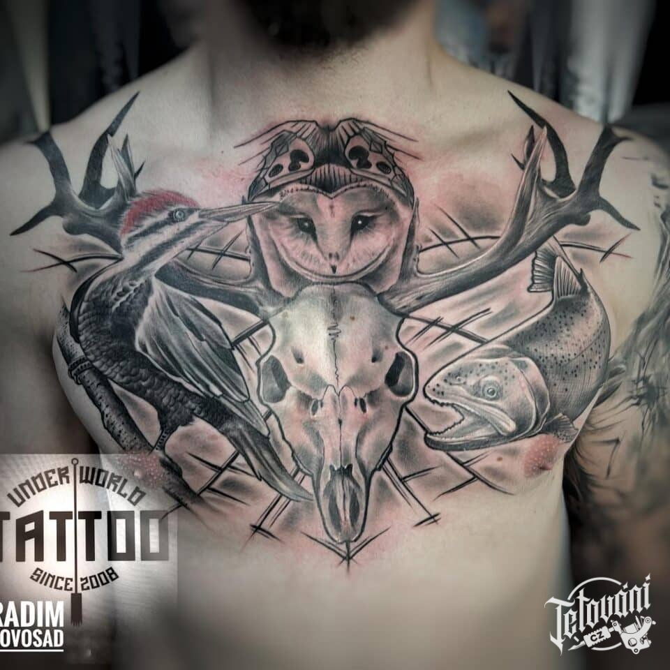 Tetování lebka, zvířata, ptáci, jelen, sova, ryba na hrudi