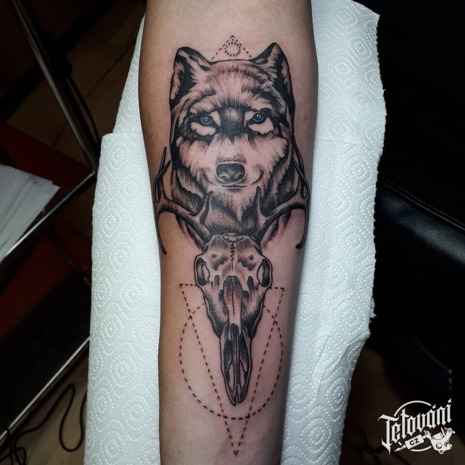 Tetování lebka, zvířata, vlk na předloktí
