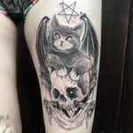 Tetování lebka, zvíře kočka na stehno