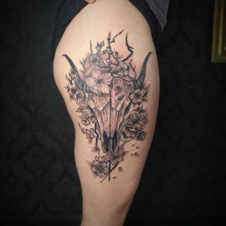Tetování lebka zvířete, býk znamení zvěrokruhu na holeni