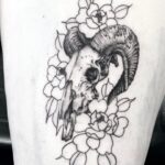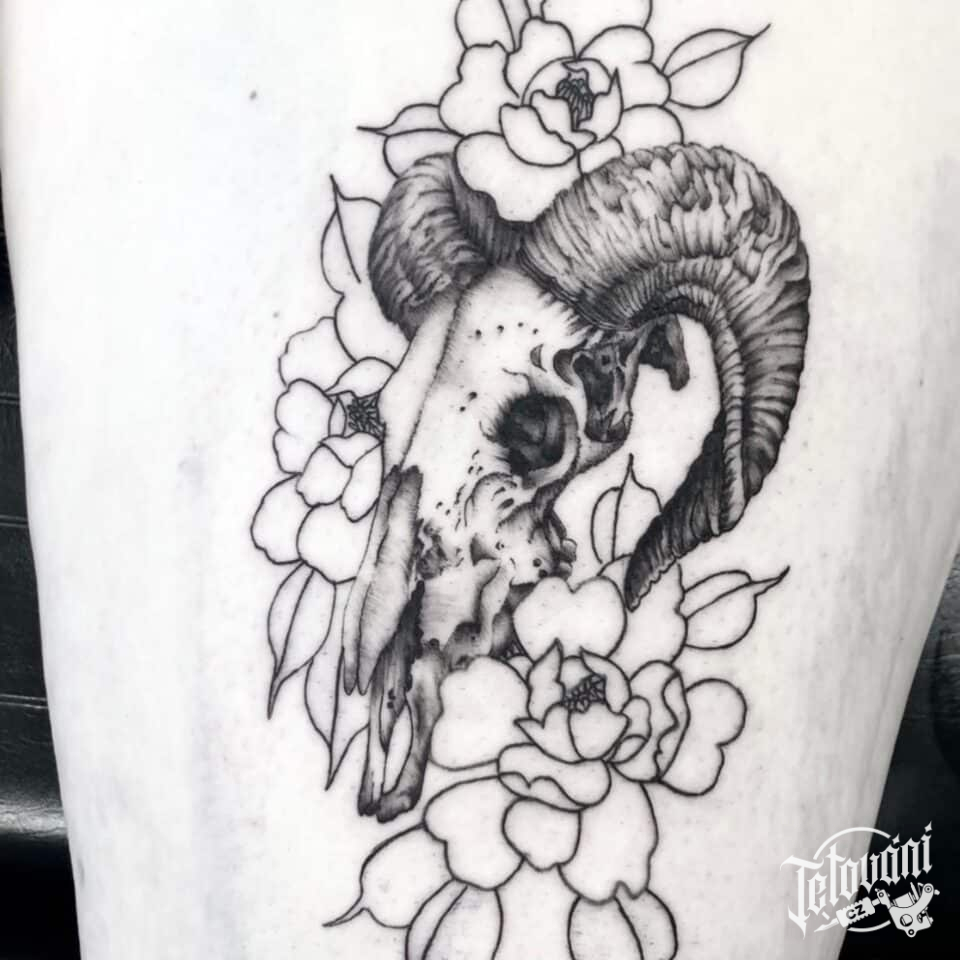 Tetování lebka zvířete, květiny na stehno
