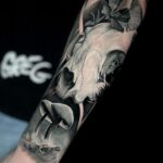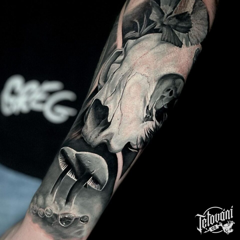 Tetování lebka zvířete, příroda, květina na předloktí