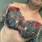 Tetování lebky vojáků a květiny, vlčí mák na prsou