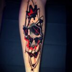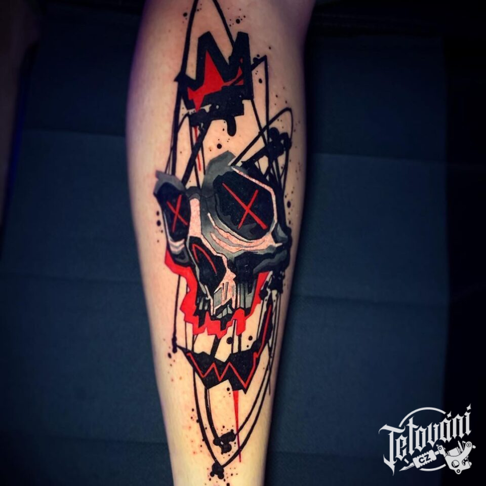 Tetování lebky s korunou, čáry a pruhy na lýtko