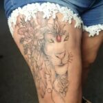 Tetování lev a květiny na bok stehna