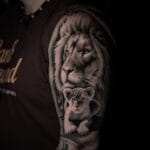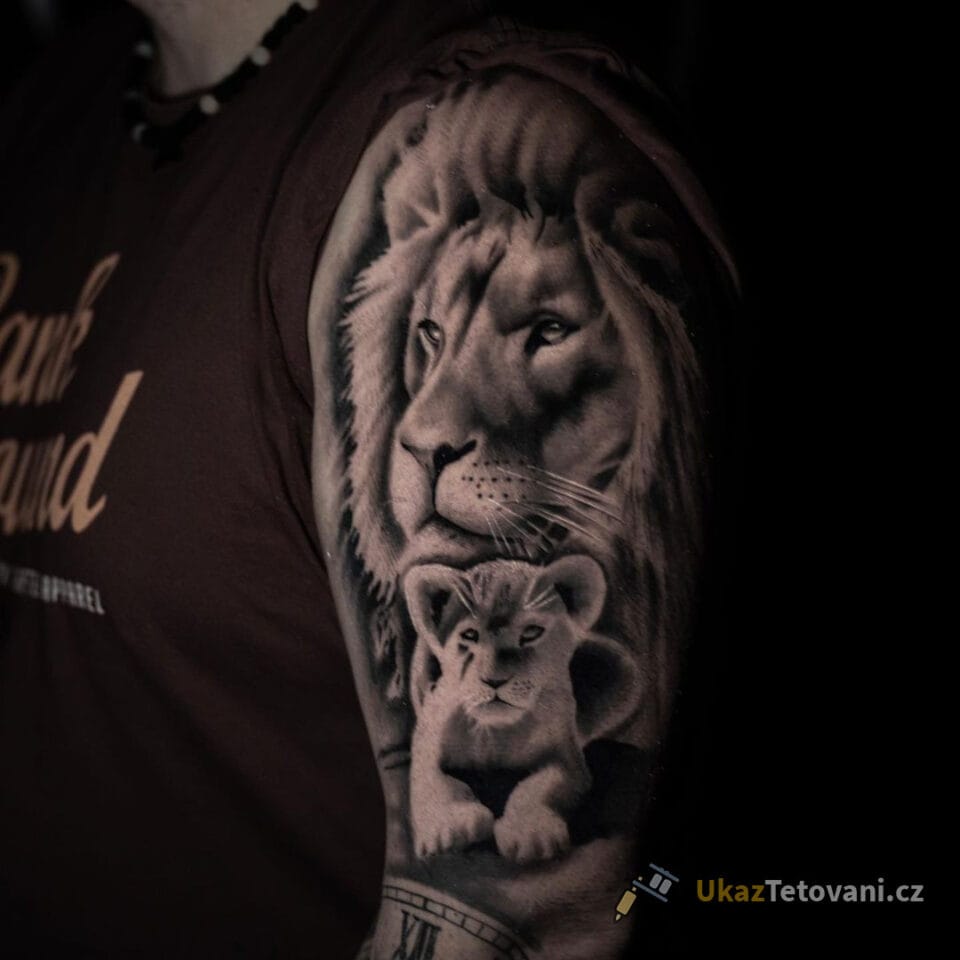 Tetování lev a lvíče symbol rodiny na rameno