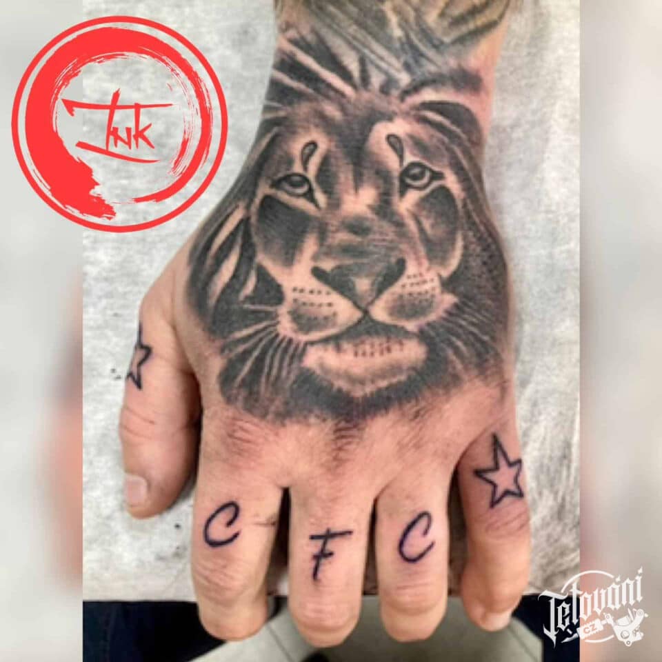 Tetování lev a písmena na prstech