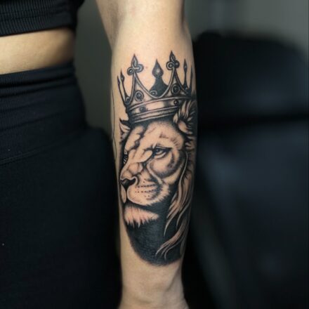 Tetování lev, koruna, znamení zvěrokruhu Panna na hřbetu ruky