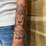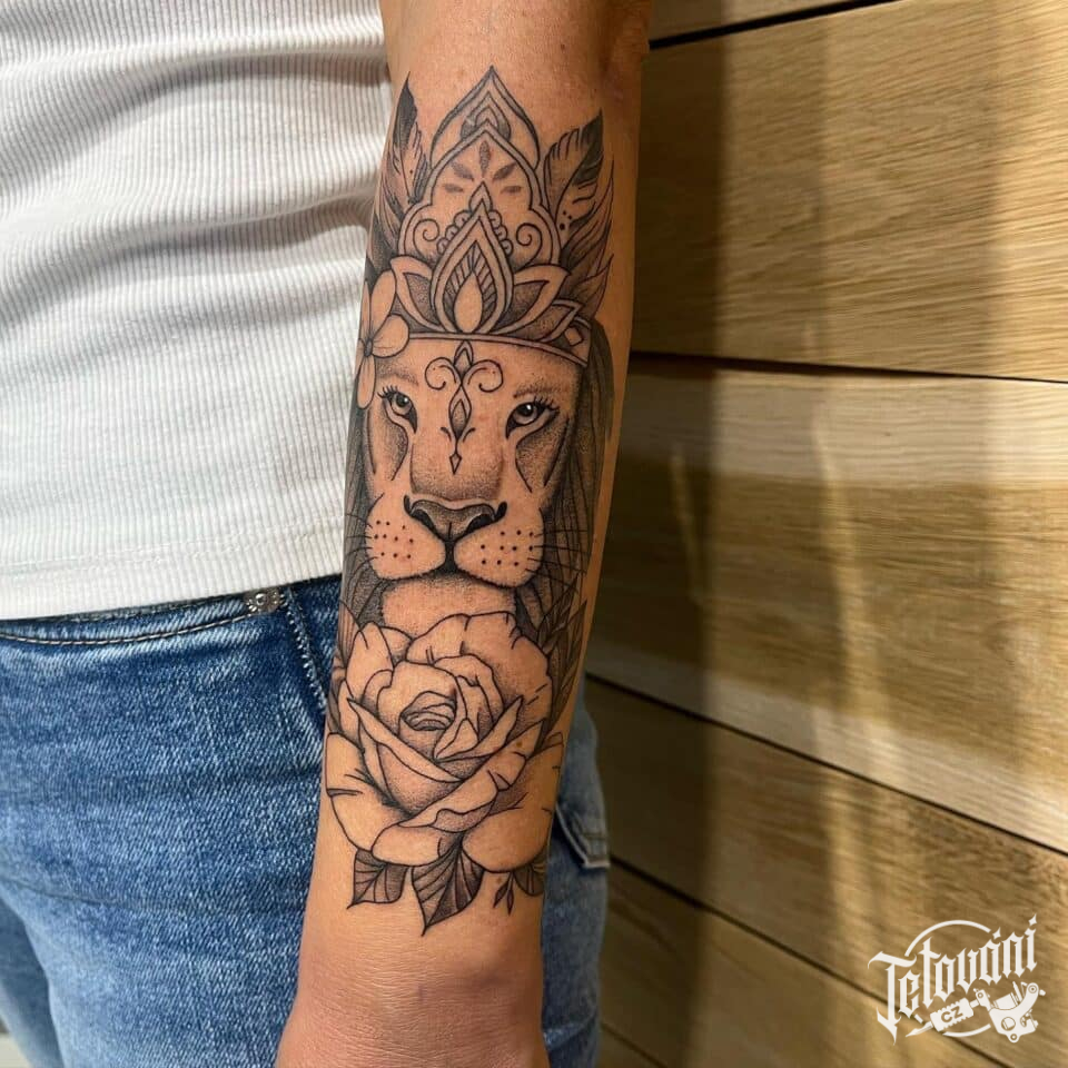 Tetování lev, růže na předloktí