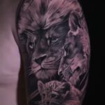 Tetování lev s lvicí a lvíčetem, symbol rodiny na rameno
