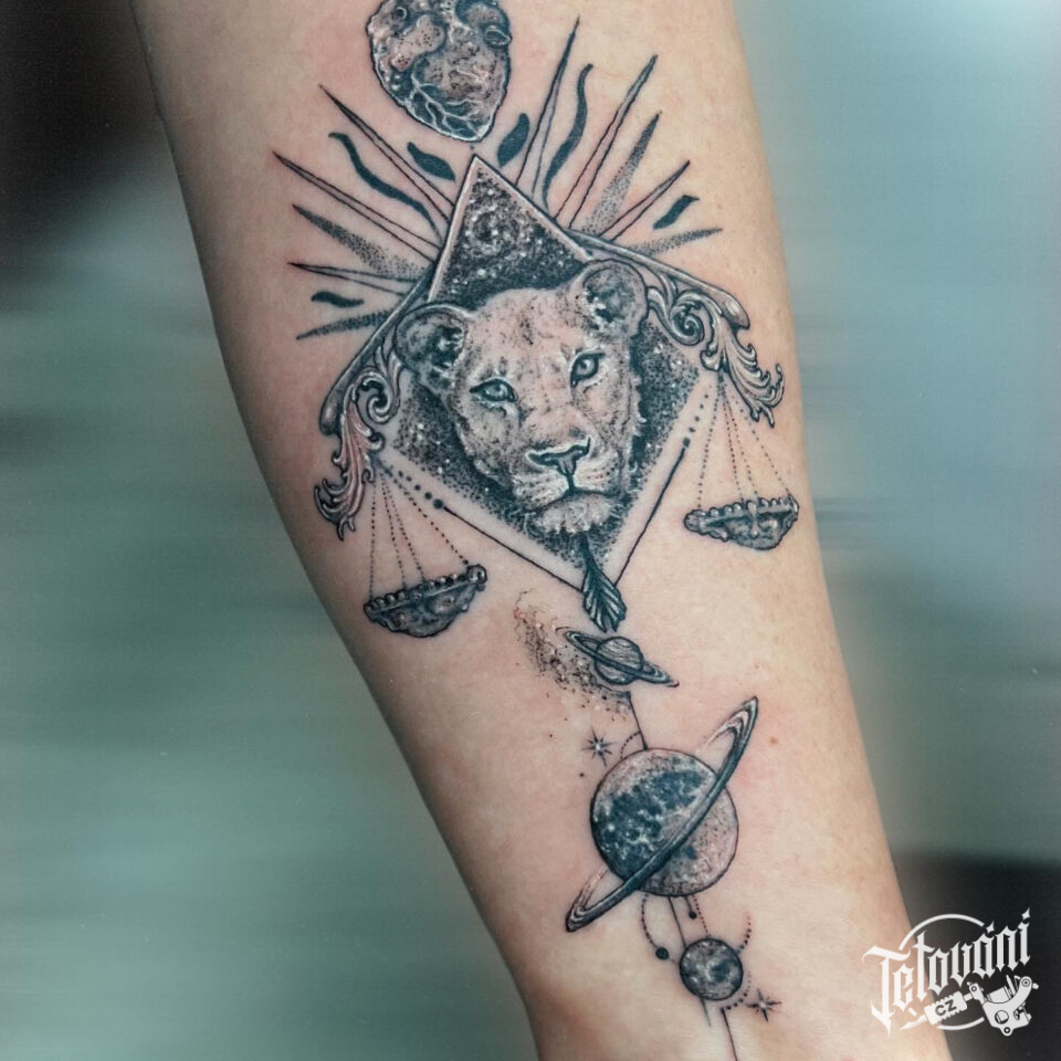 Tetování lev, váhy, planety na předlotkí