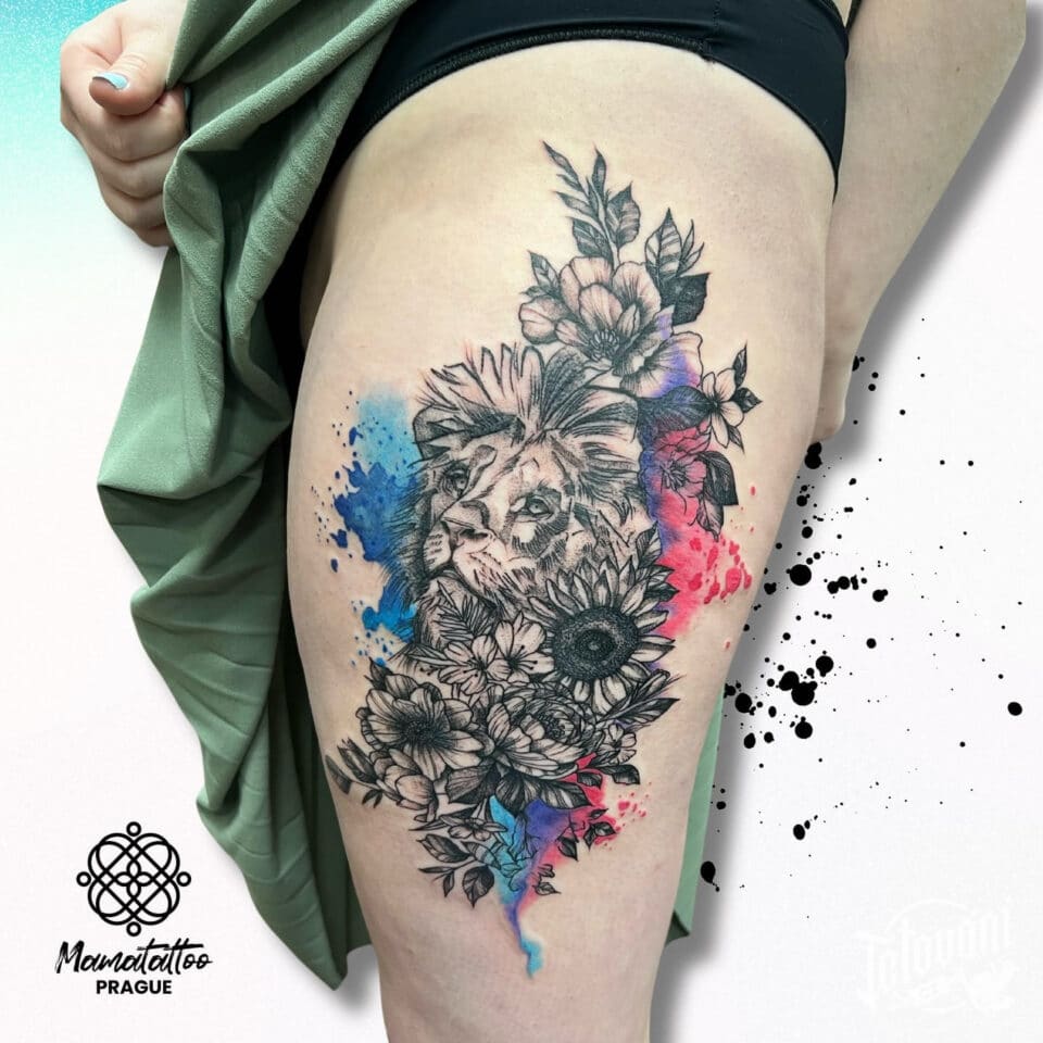 Tetování lev znamení zvěrokruhu a květiny na boku stehna