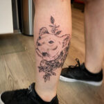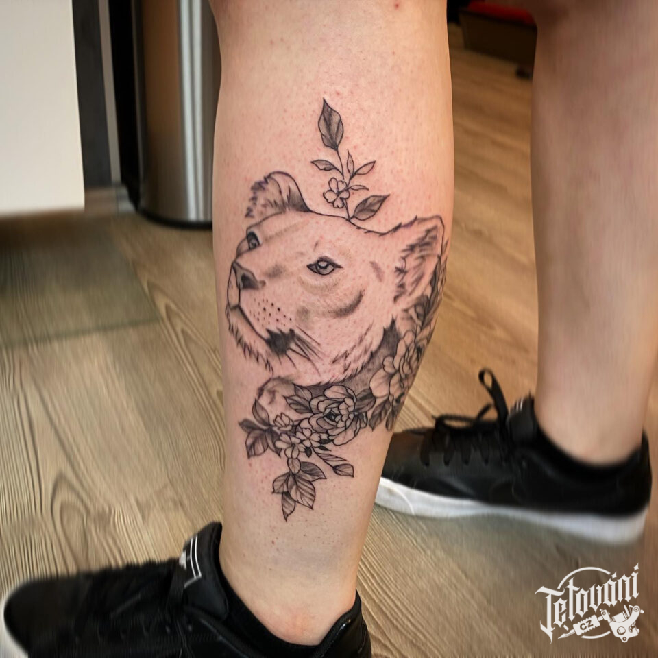 Tetování lev znamení zvěrokruhu a květiny na lýtko