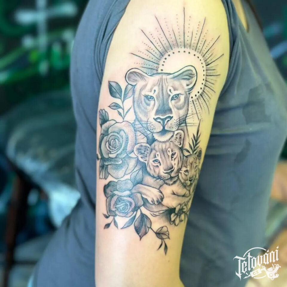 Tetování lev znamení zvěrokruhu a květiny, růže na rameno